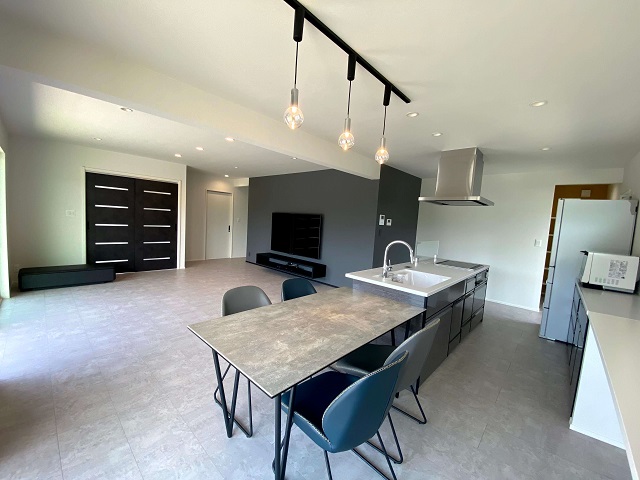 ベースとなるものには一切木目を使用せず、モノトーンでまとめた、スタイリッシュなLDK。ホワイト・グレー・ブラックそれぞれの色のバランスもじっくりと選びました。